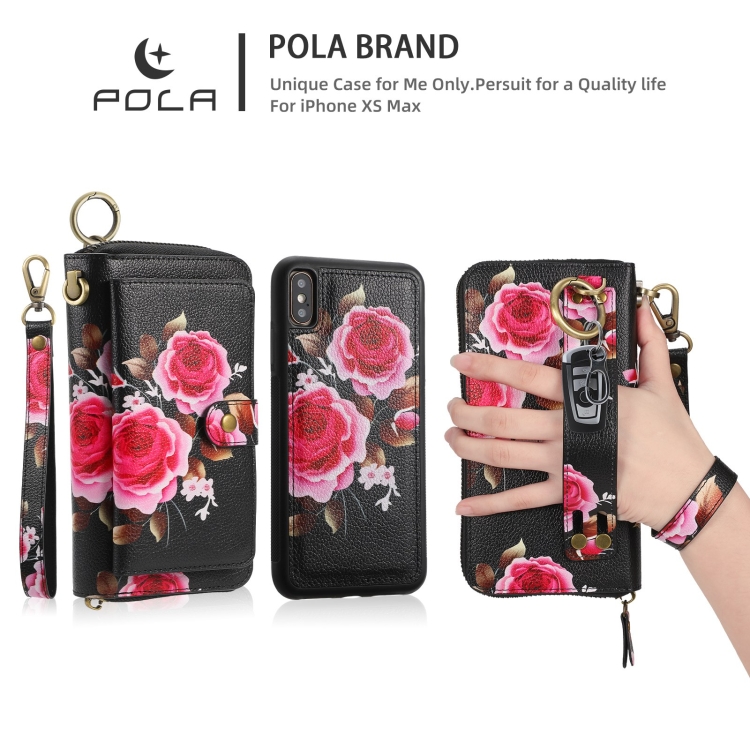 Funda de Cuero Pola Flower para iPhone Xr con Billetera y Cremallera Multifuncional (Negro)