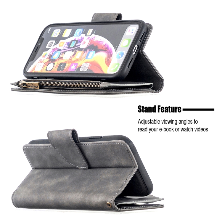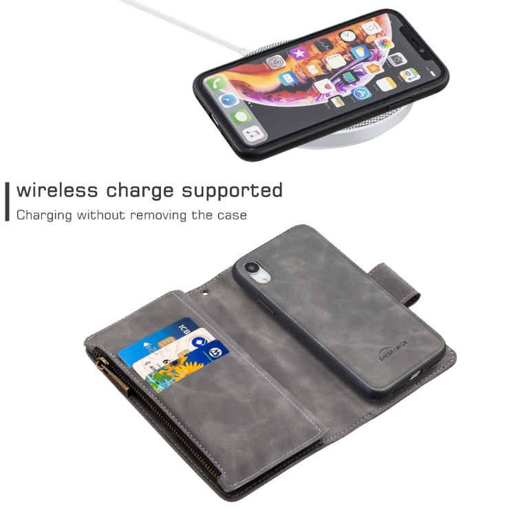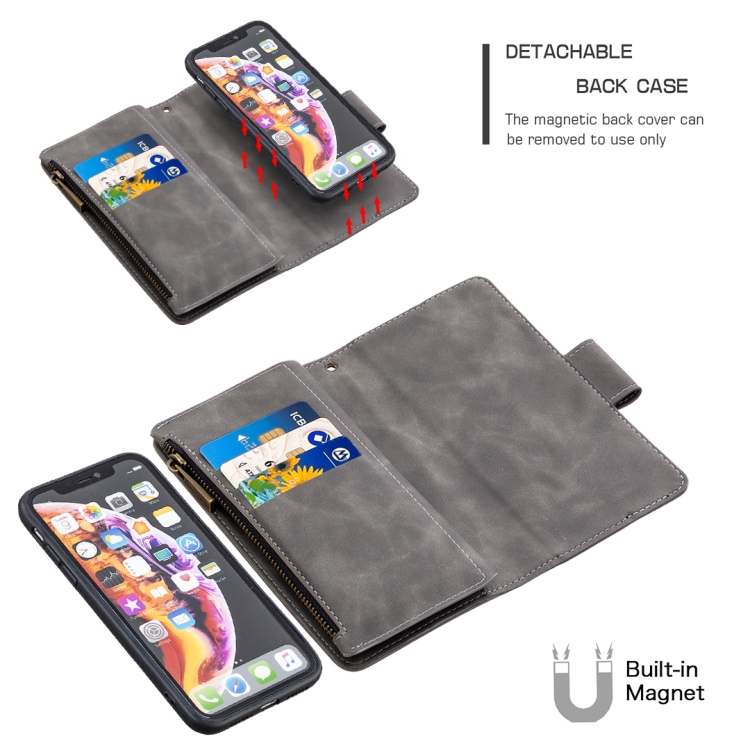 Funda para iPhone Xr Skin Feel Desmontable Cremallera Magnética Cuero de Pu Tapa Horizontal Ranuras Tarjetas Soporte Billetera Marco Fotos Cordón (Gris)