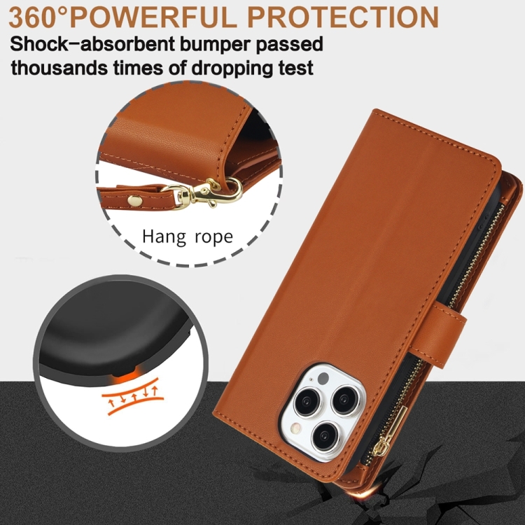Funda de Cuero para iPhone Xr Ym016 con Billetera, Tarjeta, Cremallera Rómbica y Cordón (Marrón)