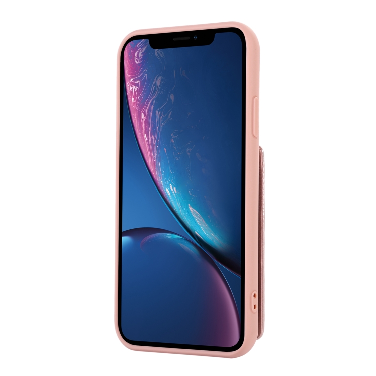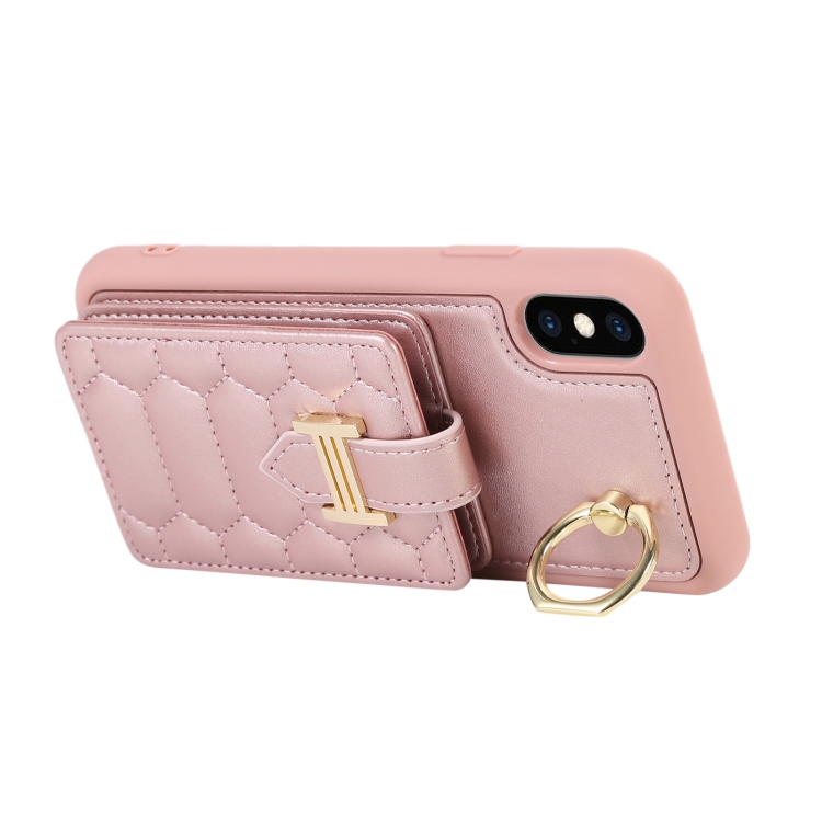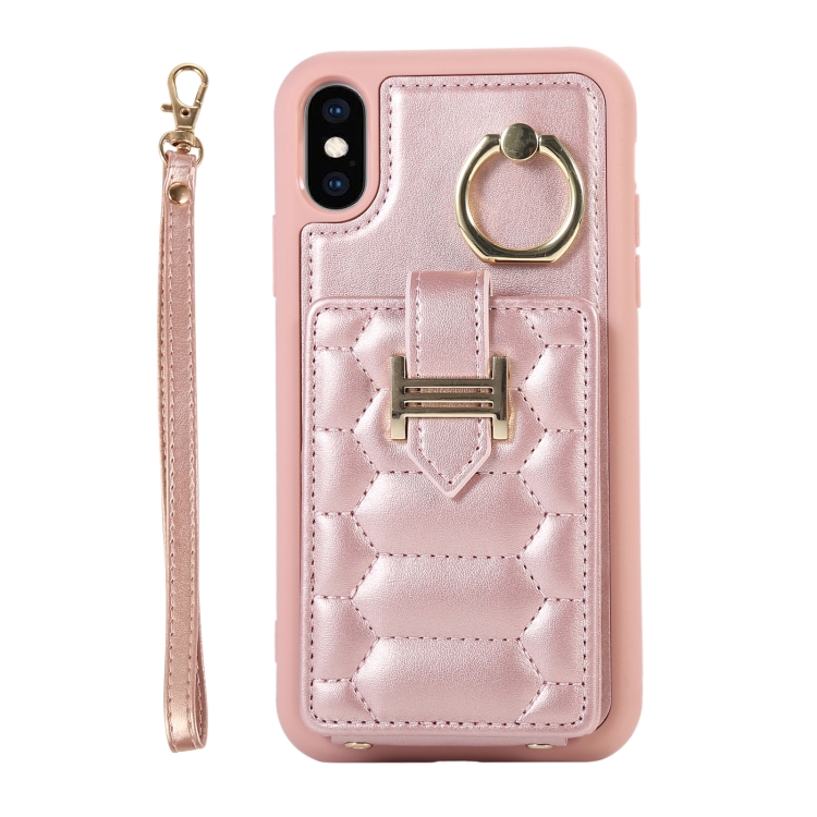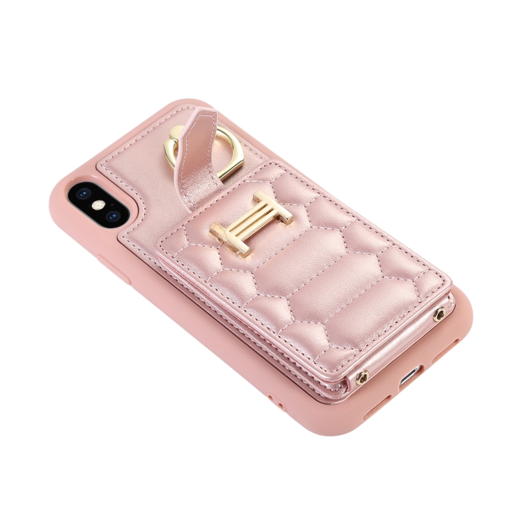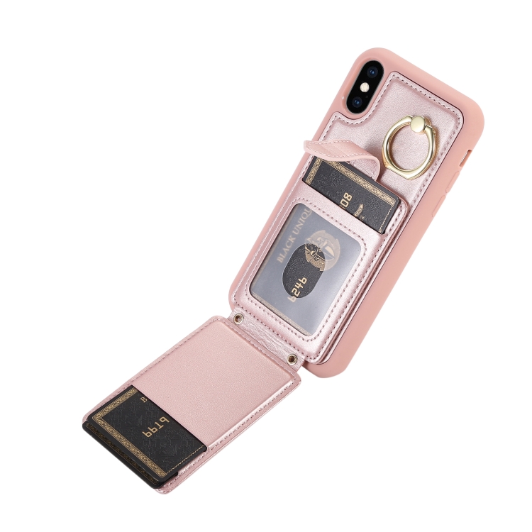Bolsa de Tarjeta Vertical Estuche para Teléfono iPhone Xs con Soporte de Anillo y Cordón Doble (Oro Rosa)