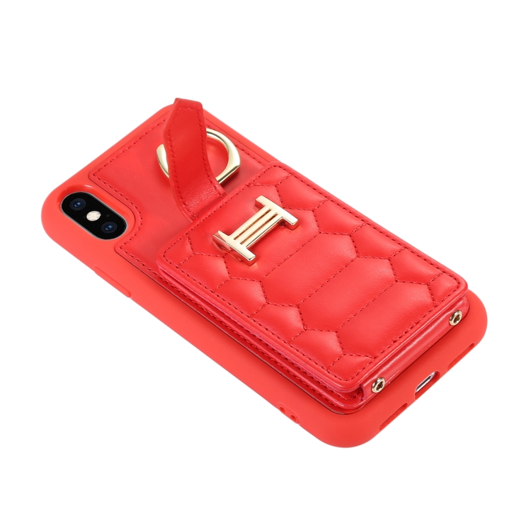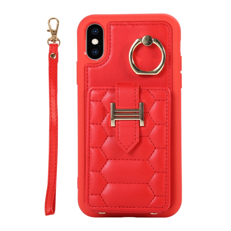 Estuche para Teléfono iPhone Xs Bolsa de Tarjeta Vertical con Soporte de Anillo y Cordón Doble (Rojo)