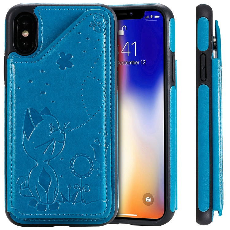 Estuche protector para iPhone Xs Cat Bee relieve patrón a prueba de golpes con ranuras para tarjetas y marco de fotos (Azul)