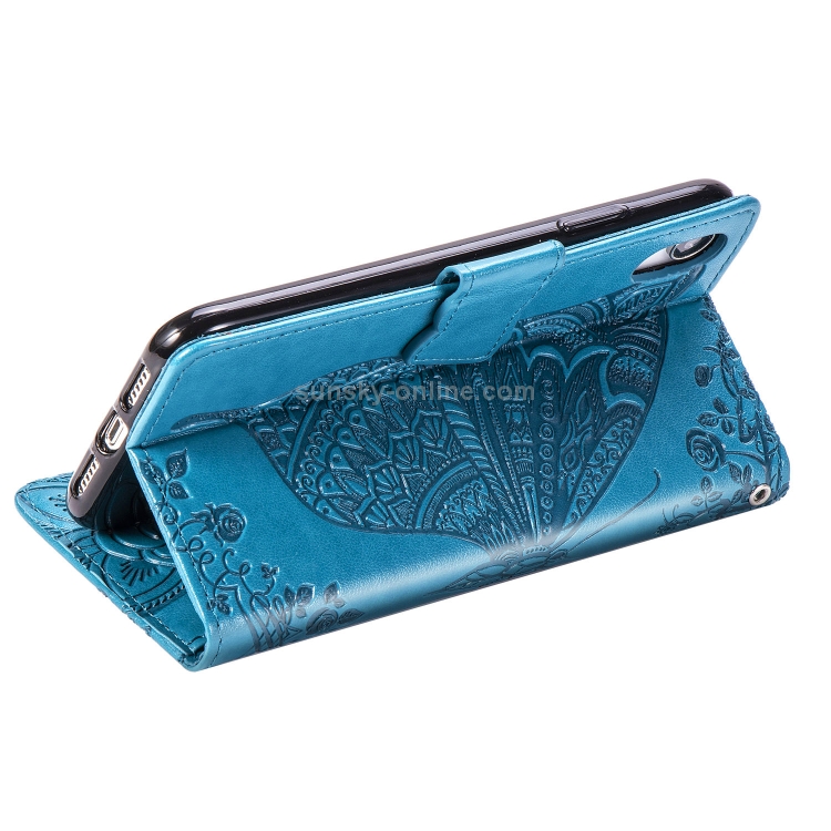 Estuche de Cuero para iPhone Xs Max Butterfly Love Flowers con Tapa Horizontal En Relieve Soporte Ranuras y Cordón (Azul)