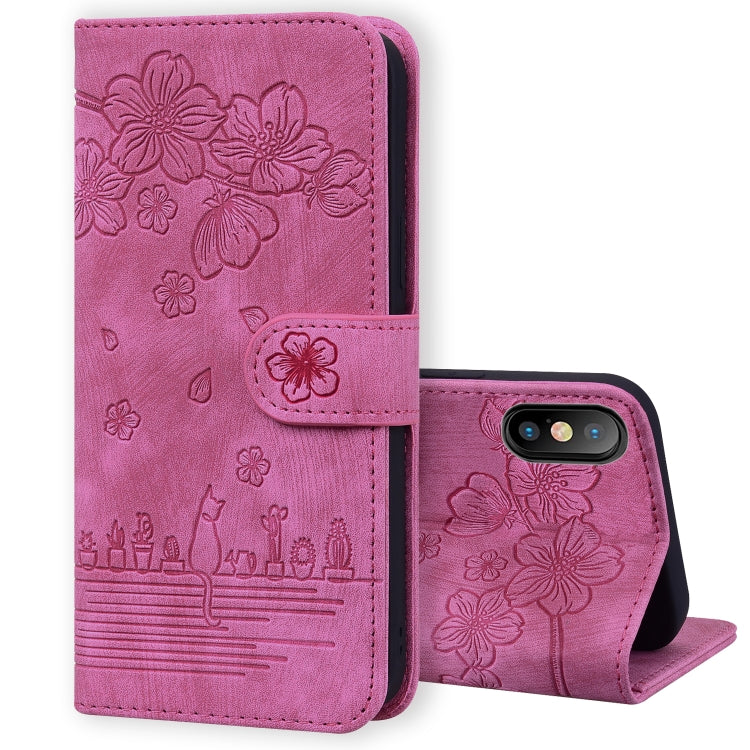 Estuche de Cuero para iPhone Xs Max Cartoon Sakura Cat En Relieve (Rosa Roja)