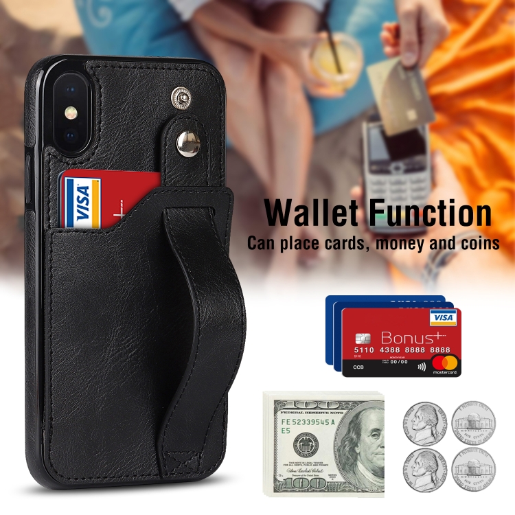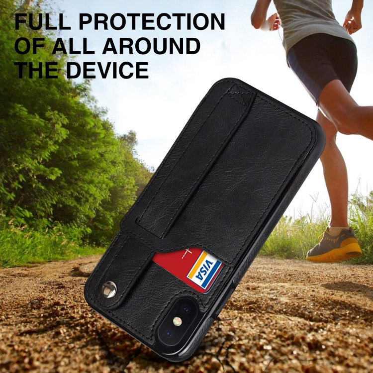Funda para iPhone Xs Max Crazy Horse Texture Cuero TPU + PU a Prueba de Golpes con Ranura para Tarjeta y Correa para la Muñeca (Negro)