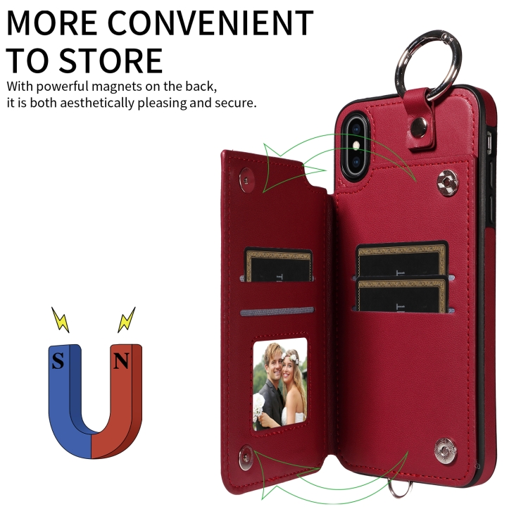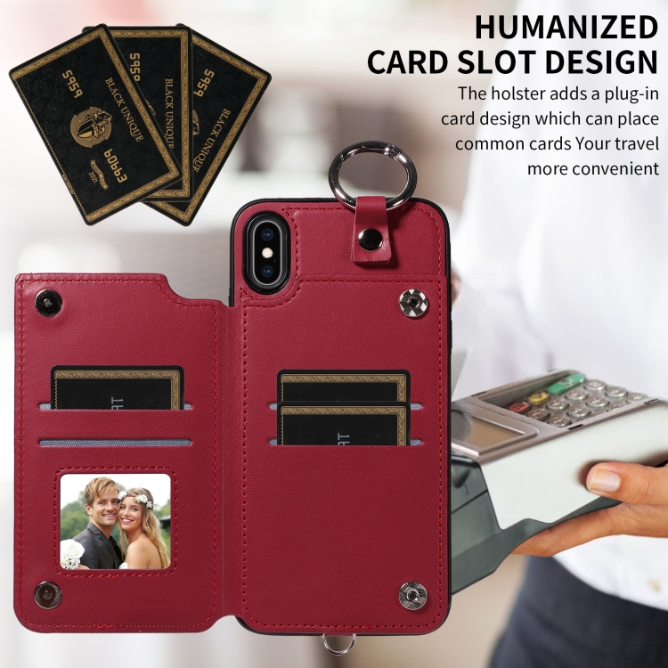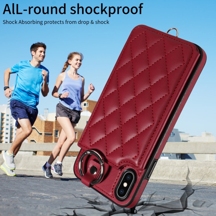 Estuche para Teléfono iPhone Xs Max Bolsa para Tarjetas Textura Rómbica Cordón Corto (Rojo Vino)