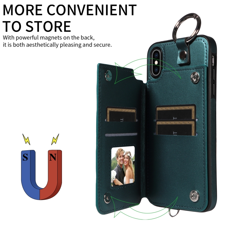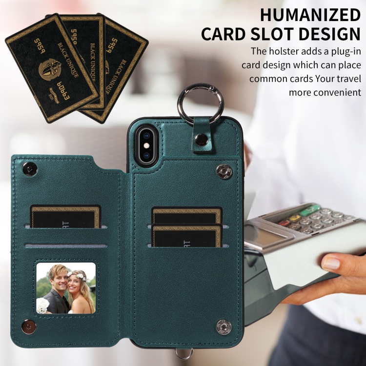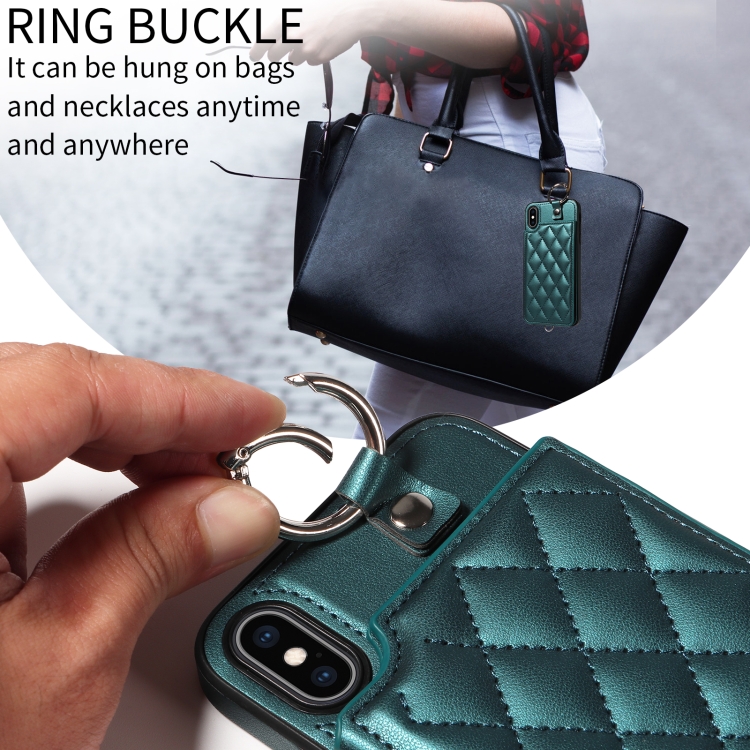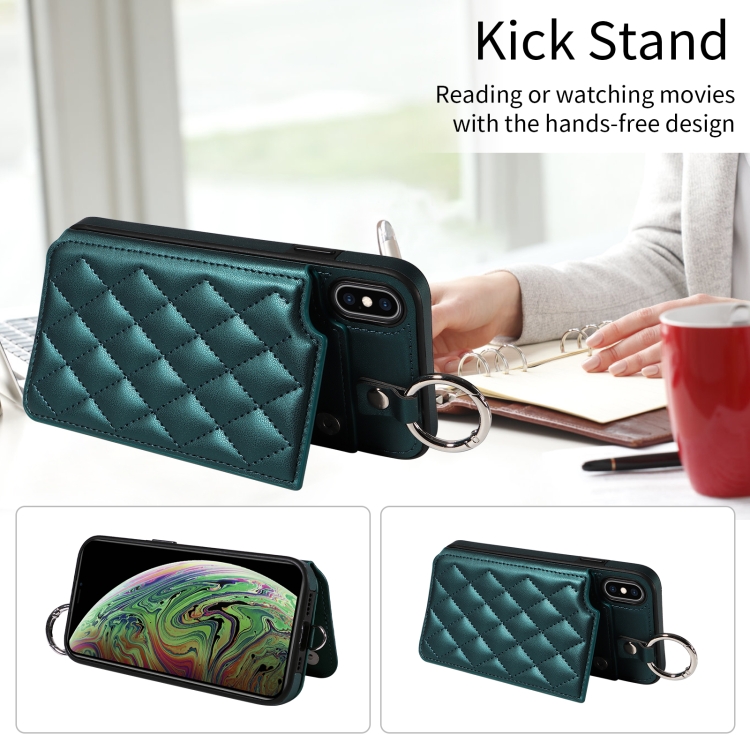 Estuche para teléfono iPhone Xs Max con bolsa para tarjetas textura rómbica y cordón corto (Verde)