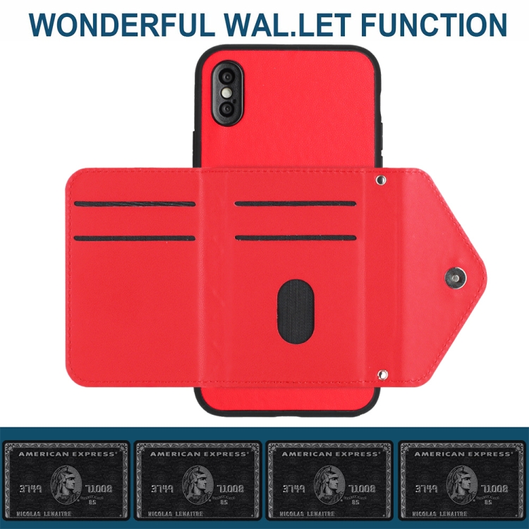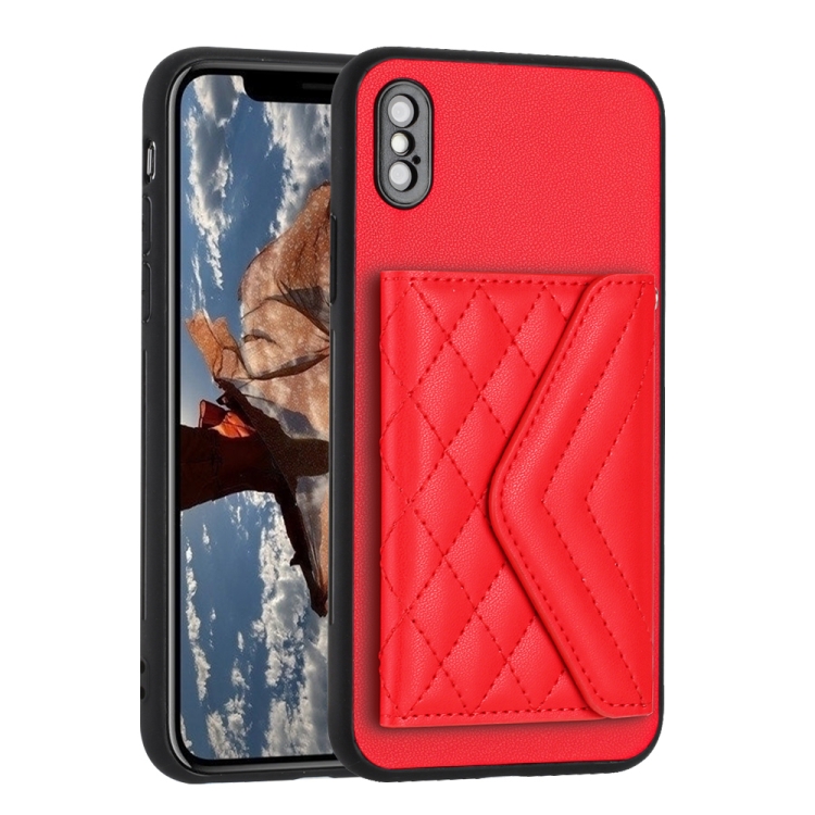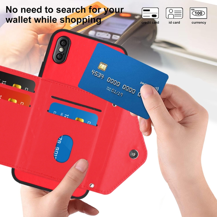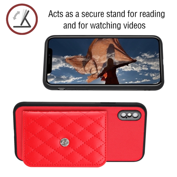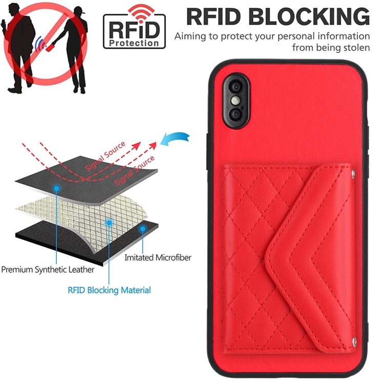 Estuche para Teléfono iPhone Xs Max RFID con Bolsa para Tarjetas Textura Rómbica y Cordón Largo (Rojo)