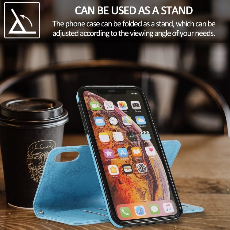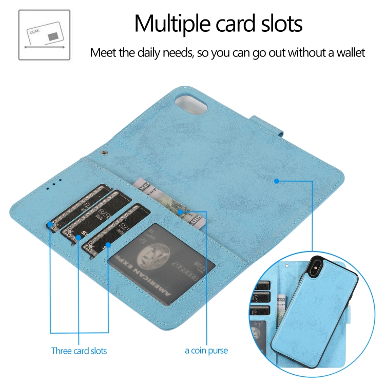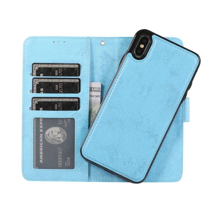 Funda para iPhone Xs Max Klt888-2 Retro 2 en 1 Cuero TPU + PU con Tapa Horizontal Magnética Desmontable Soporte Ranuras Tarjetas Marco Fotos Billetera (Azul Cielo)