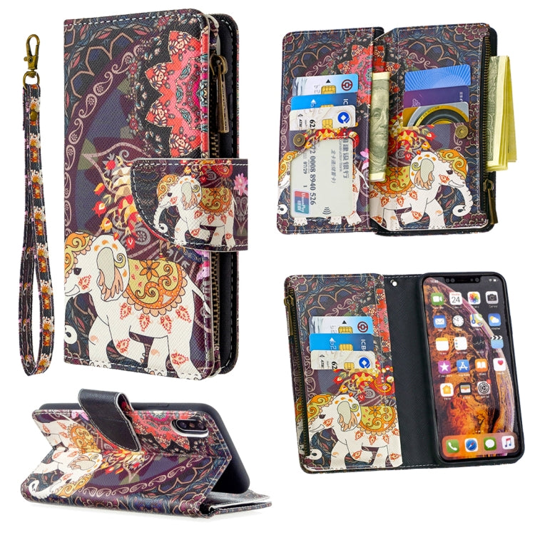 Funda de Cuero para iPhone Xs Max con Patrón de Dibujo Cremallera, Tapa Horizontal, Soporte y Ranuras para Tarjetas (Elefantes de Flores)