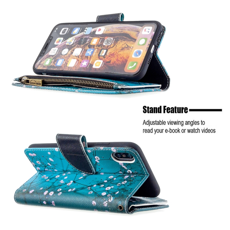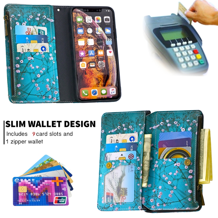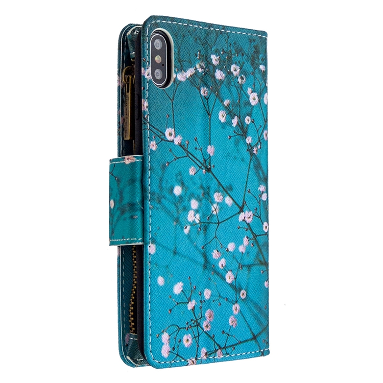 Funda de Cuero para iPhone Xs Max Patrón Dibujo Cremallera con Tapa Horizontal Soporte Ranuras para Tarjetas y Billetera (Flor del Ciruelo)