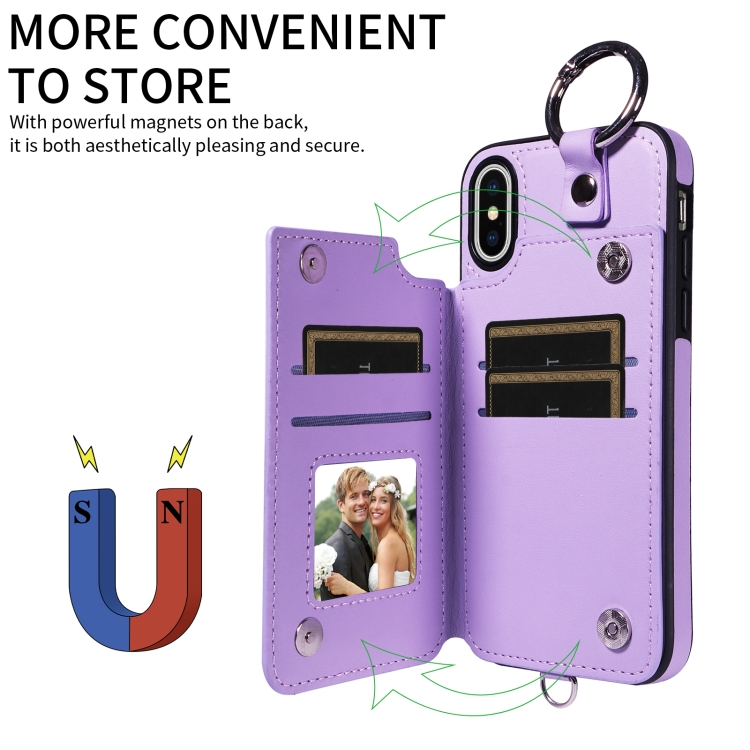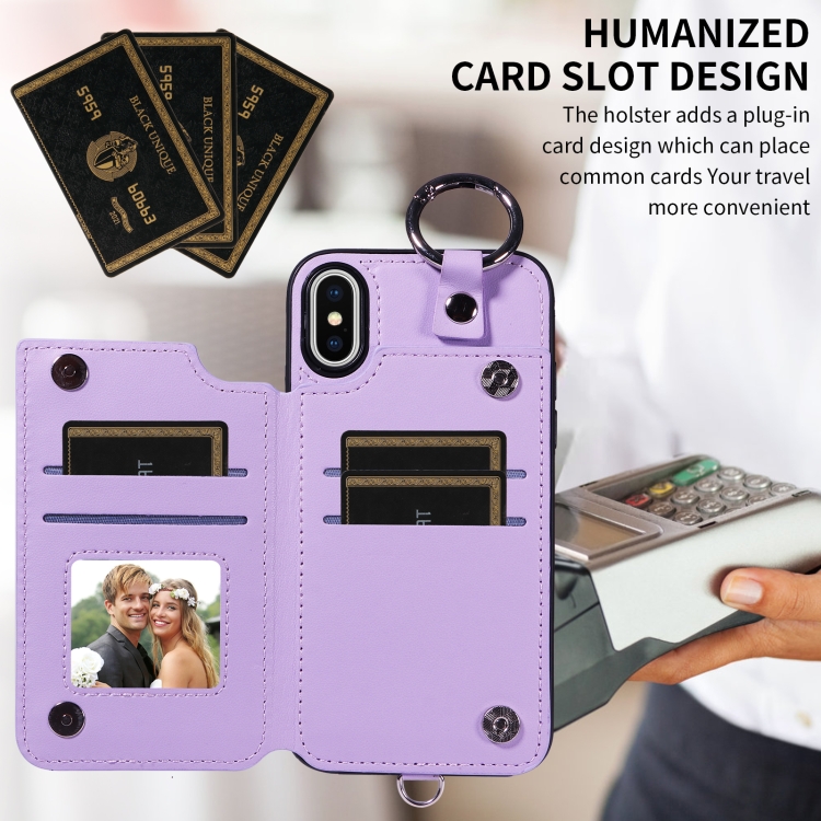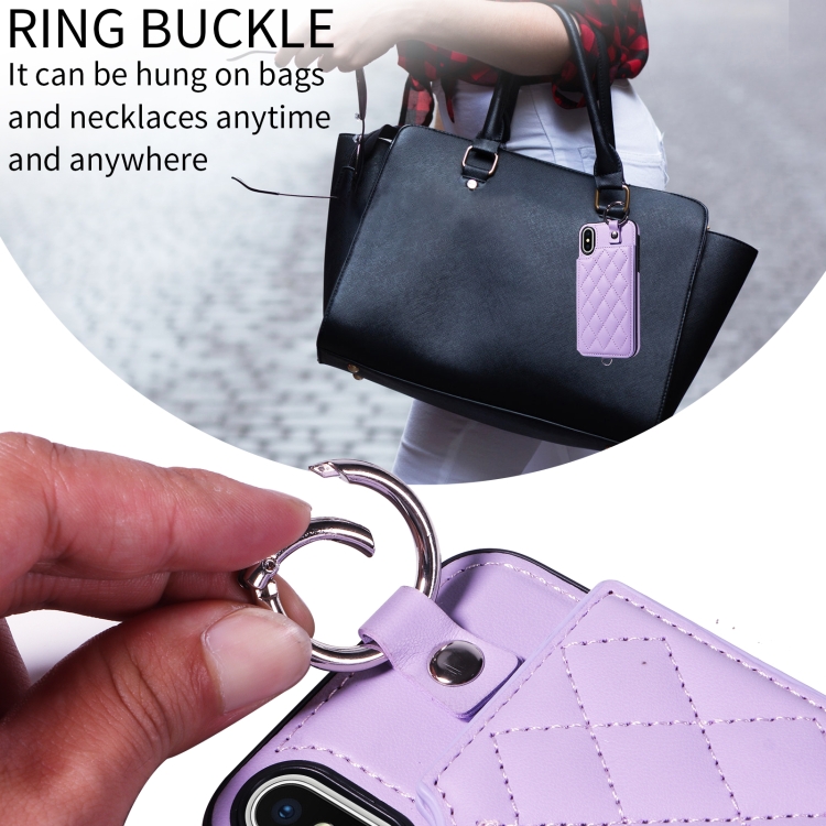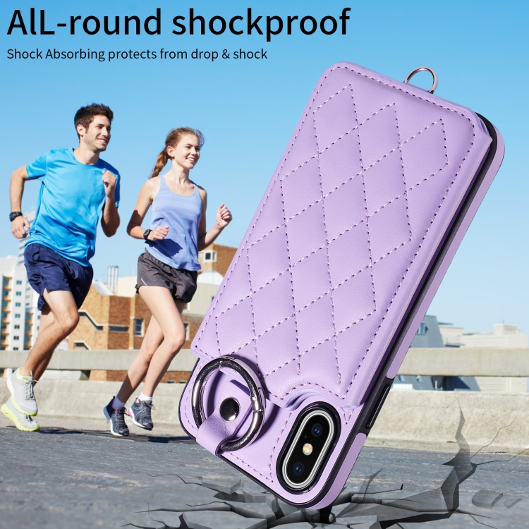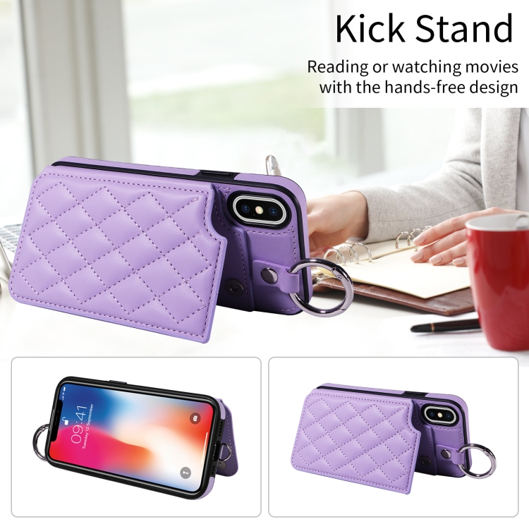 Estuche para Teléfono iPhone Xs X con Bolsa para Tarjetas Textura Rómbica y Cordón Corto (Púrpura)