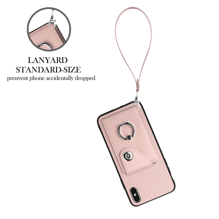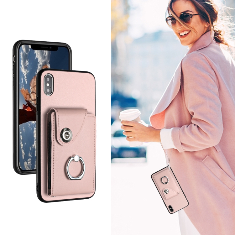 Funda para Teléfono iPhone Xs / X de PU con Soporte para Anillo y Bolsa para Tarjeta con Cordón (Rosa)