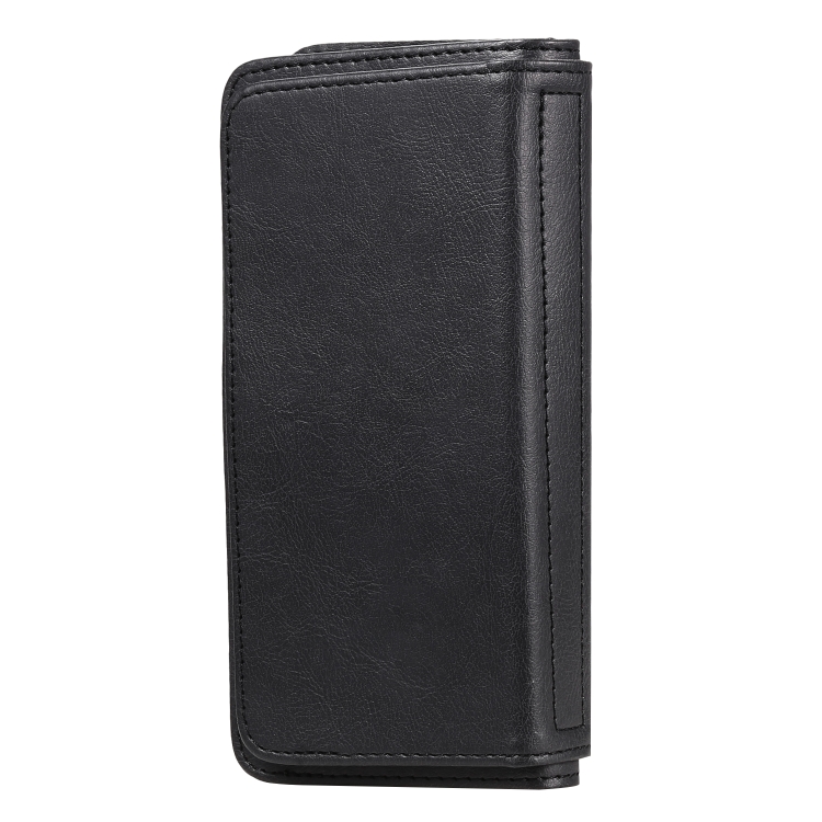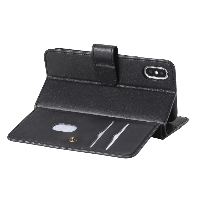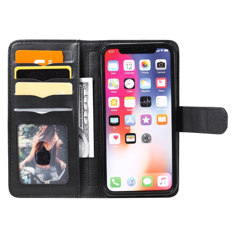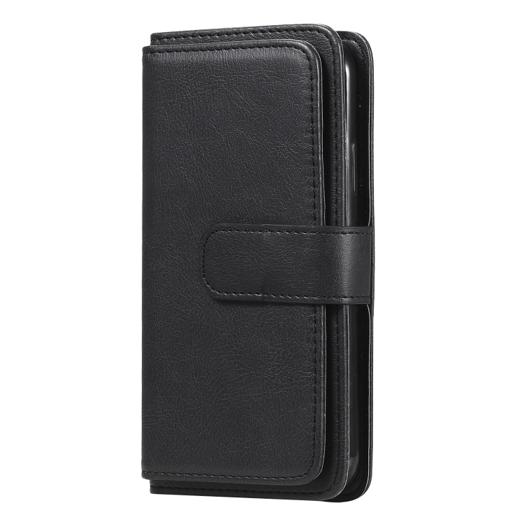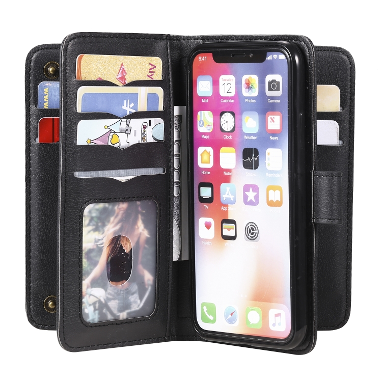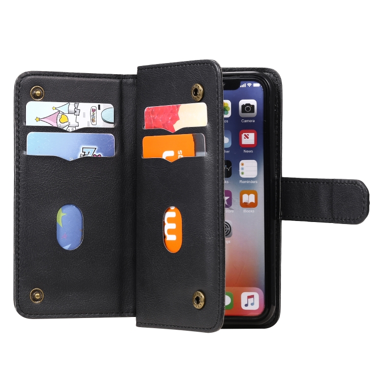 Funda de Cuero para iPhone Xs / X con Hebilla de Cobre Magnética Multifuncional, Tapa Horizontal, 10 Ranuras para Tarjetas, Billetera, Soporte y Marco de Fotos (Negro)