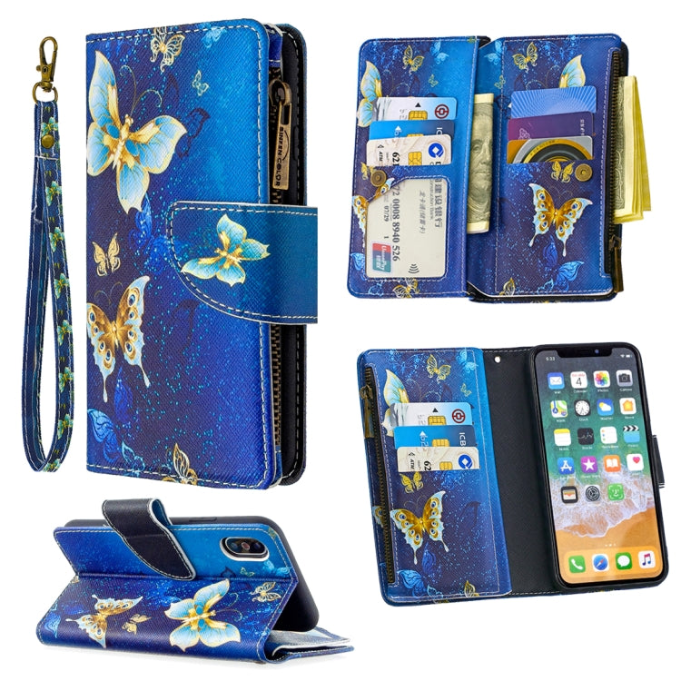 Funda de Cuero para iPhone Xs / X con Patrón Dibujo Coloreado Cremallera Tapa Horizontal Soporte Ranuras Tarjetas Billetera (Mariposa Dorada)