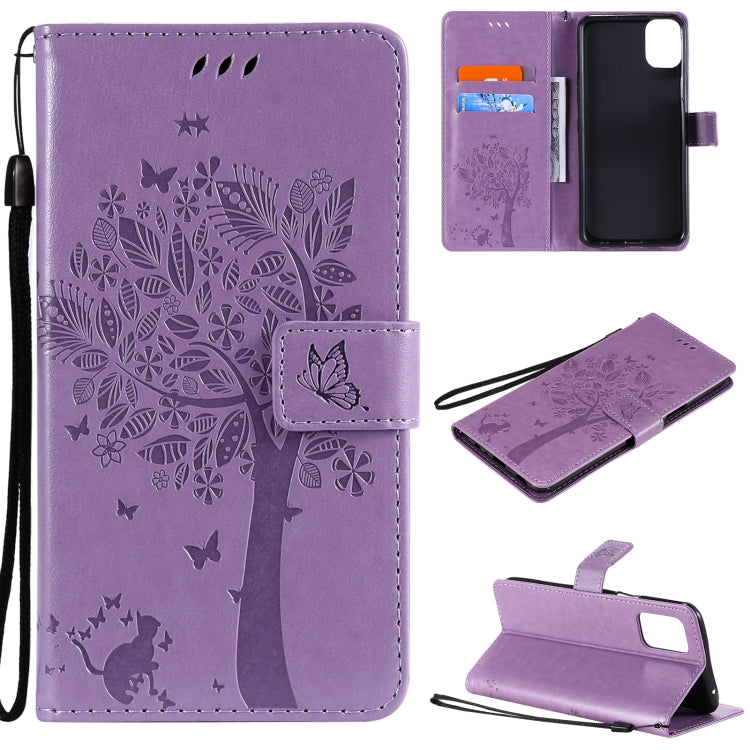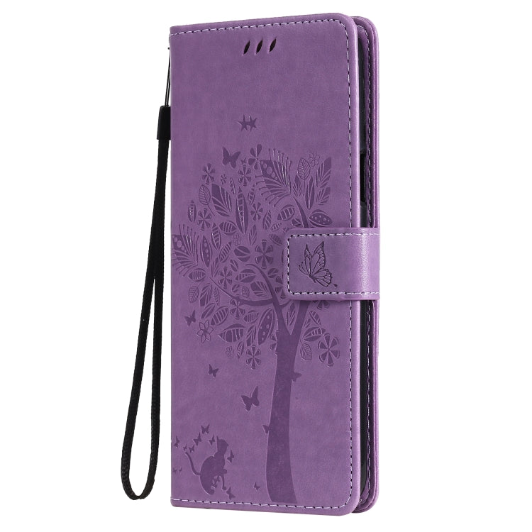 Funda Cuero PU para LG K42 con Patrón Árbol y Gato, Flip Horizontal, Soporte, Ranuras y Cordones (Púrpura Claro)
