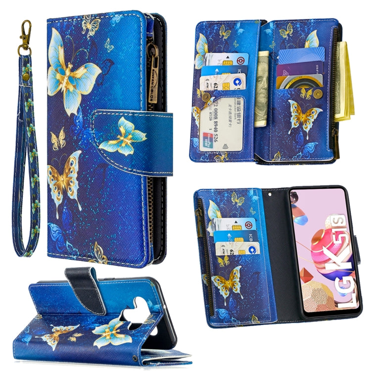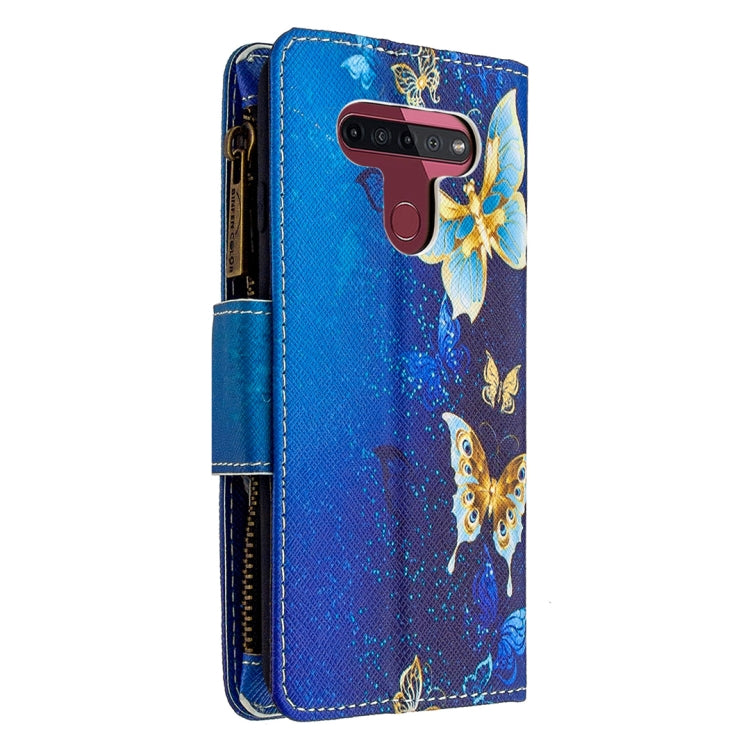 Estuche de Cuero Abatible Horizontal para LG K51 con Cremallera, Soporte, Ranuras y Billetera (Mariposa Dorada)