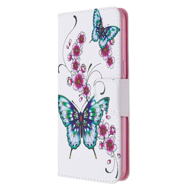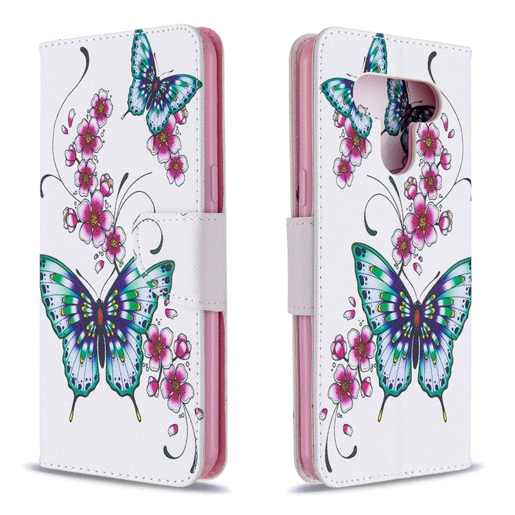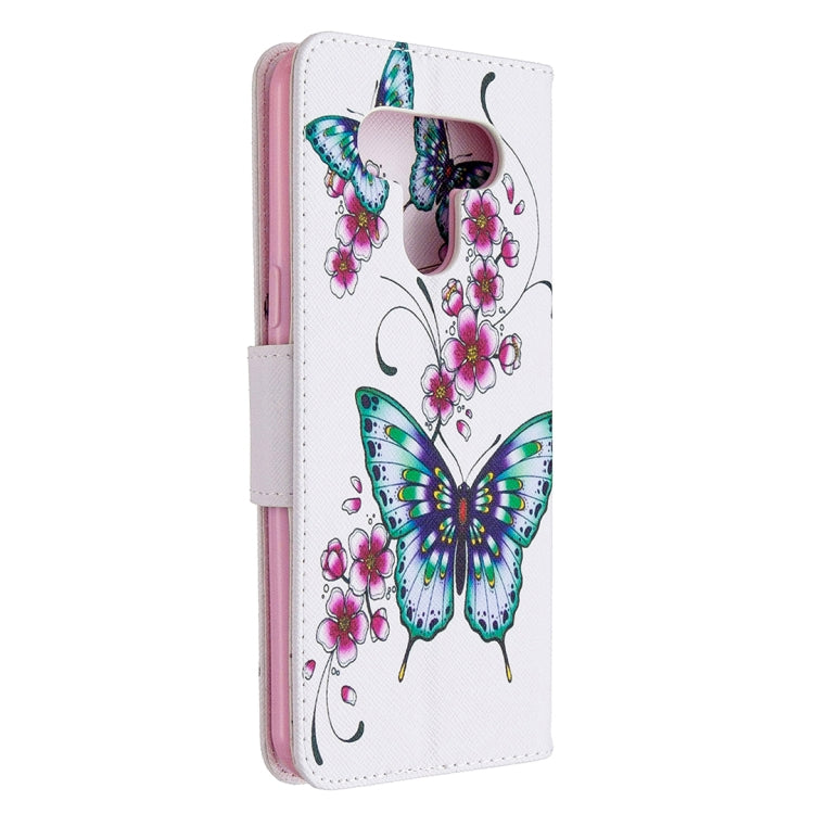 Estuche de Cuero Abatible Horizontal LG K51 con Soporte, Ranuras para Tarjetas y Billetera (Flor de Melocotón y Mariposa)