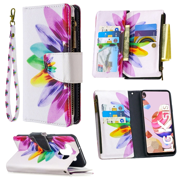 Funda de Cuero para LG K51 con Patrón de Colores, Cremallera, Soporte y Ranuras (Sun Flower)