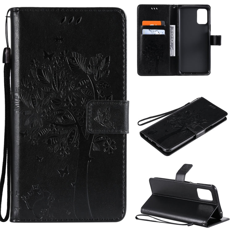 Funda Cuero PU LG K52 Árbol y Gato Patrón Impresión Prensada Horizontal con Soporte y Ranuras (Negro)