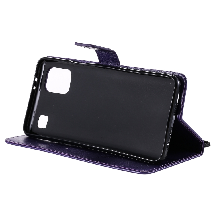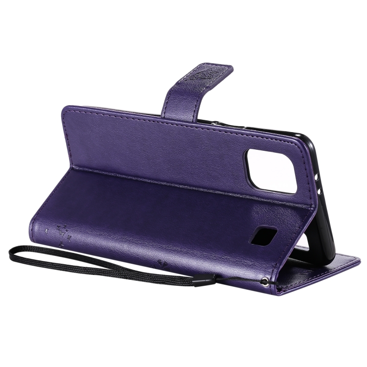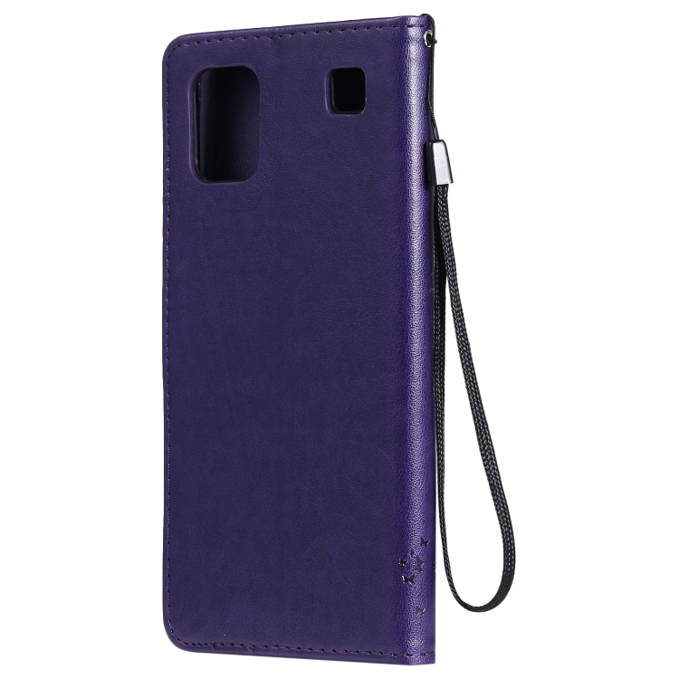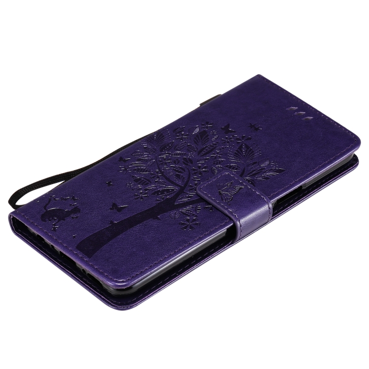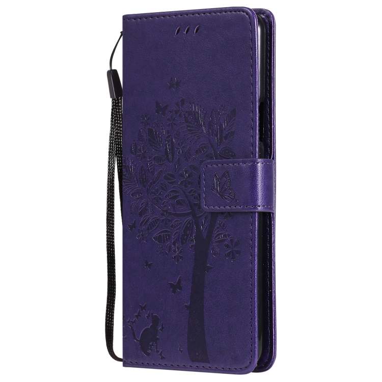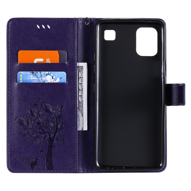 Funda Cuero Flip LG K52 Árbol y Gato Patrón con Soporte, Ranuras y Cordón (Púrpura)