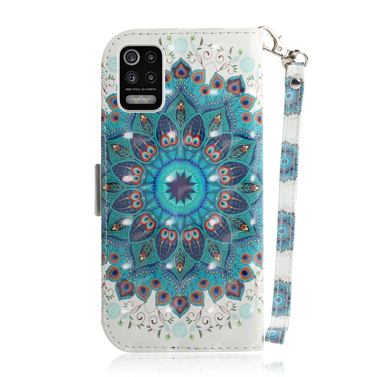Funda de Cuero Abatible Horizontal para LG K52 con Dibujo 3D, Soporte, Ranuras, Billetera y Cordón (Corona de Pavo Real)