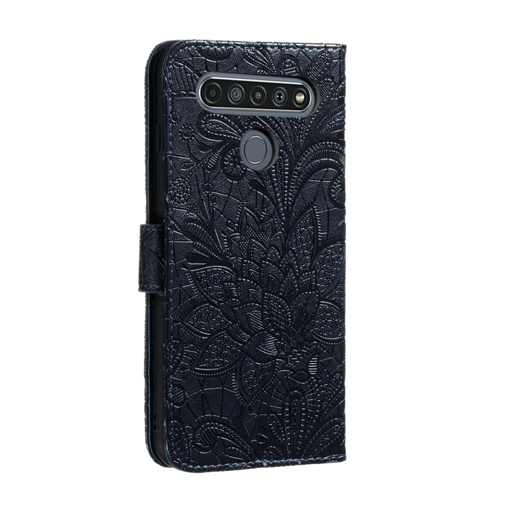 Funda de Cuero para LG K61 Lace Flower con Tapa Horizontal, Soporte, Ranuras para Tarjetas y Billetera (Azul Oscuro)
