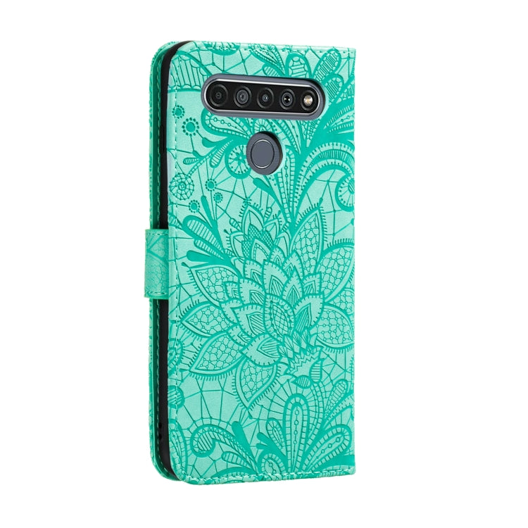 Funda de Cuero para LG K61 Lace Flower con Tapa Horizontal, Soporte, Ranuras para Tarjetas y Marco de Fotos (Verde)
