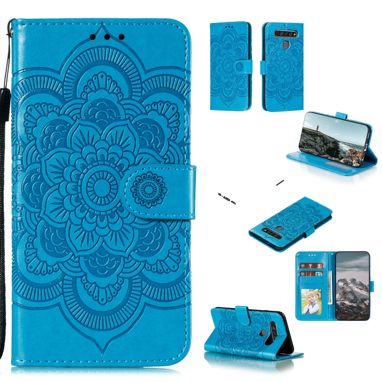 Funda de Cuero Pu para LG K61 Mandala con Diseño en Relieve, Tapa Horizontal, Soporte, Ranuras y Cordón (Azul)
