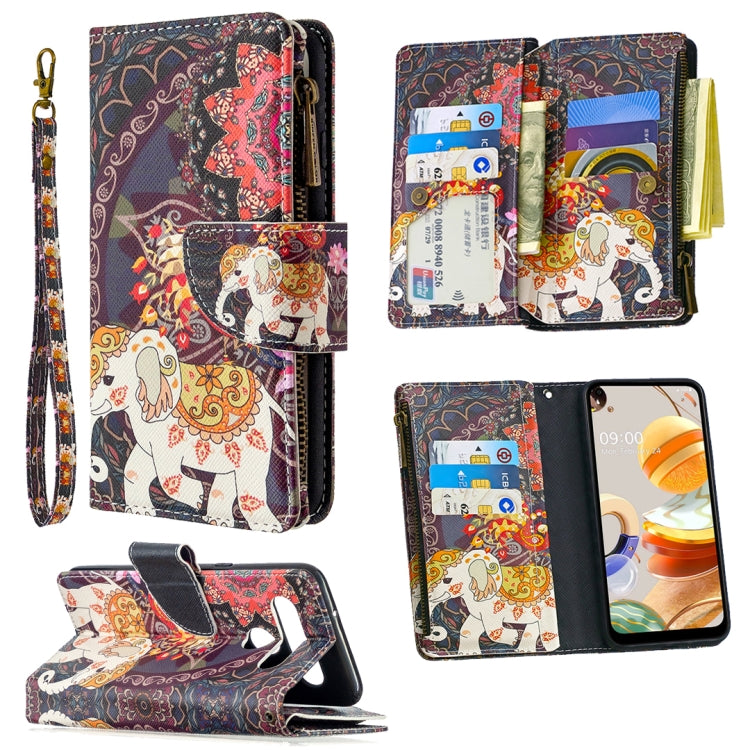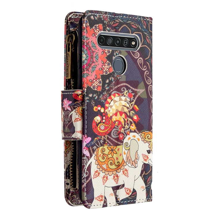 Funda de Cuero para LG K61 con Cremallera, Soporte y Ranuras para Tarjetas (Elefantes de Flores)