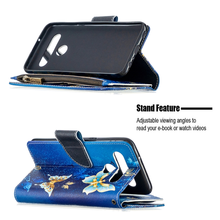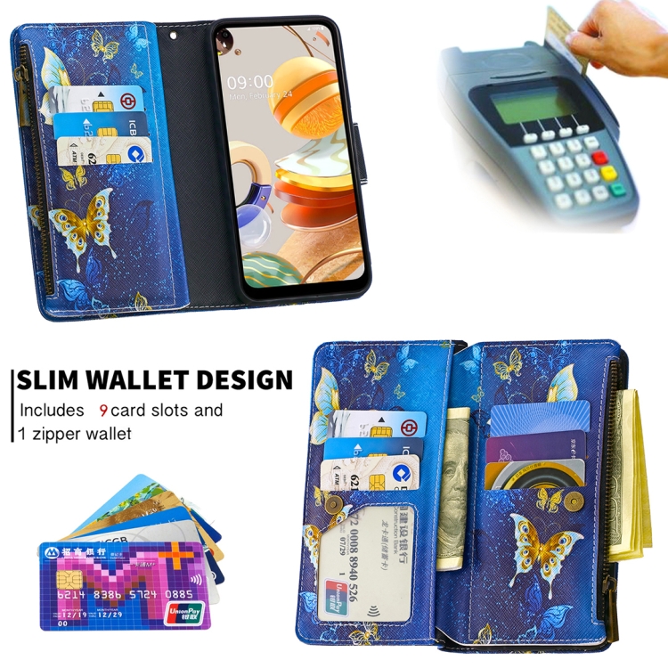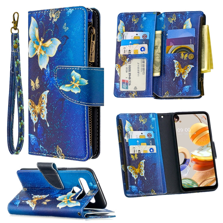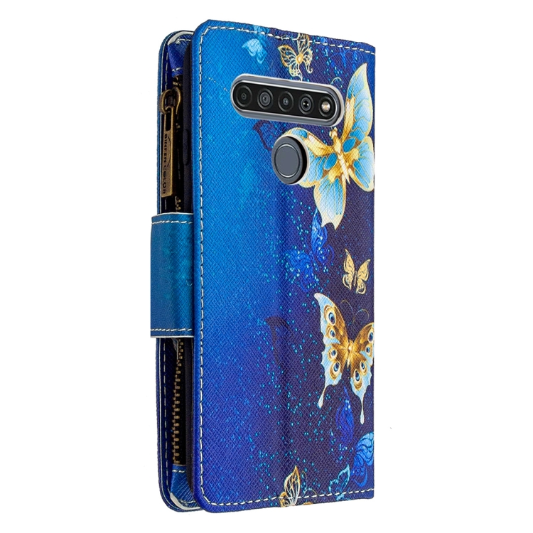 Funda de Cuero para LG K61 con Patrón de Colores, Cremallera, Soporte y Ranuras para Tarjetas (Mariposa Dorada)