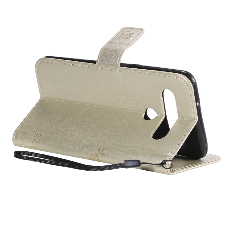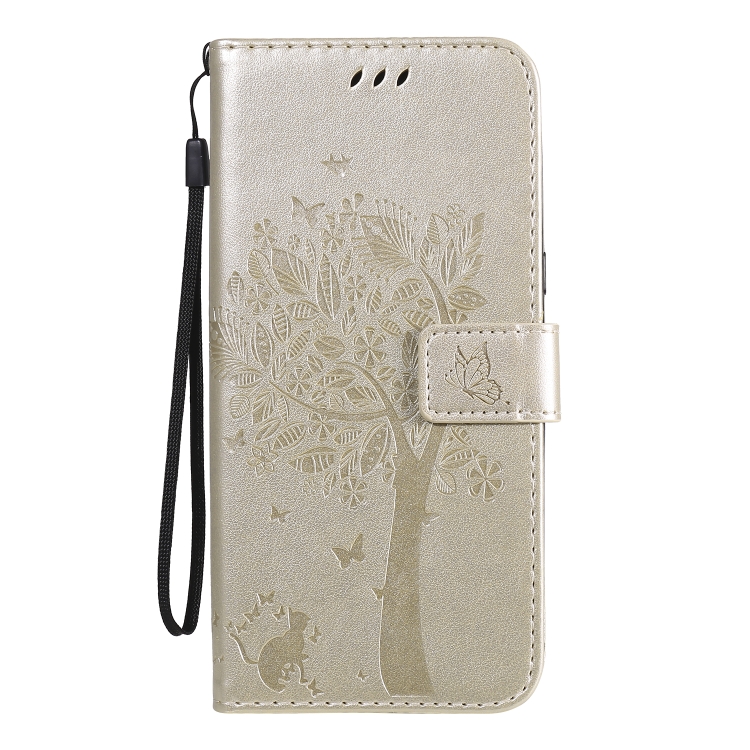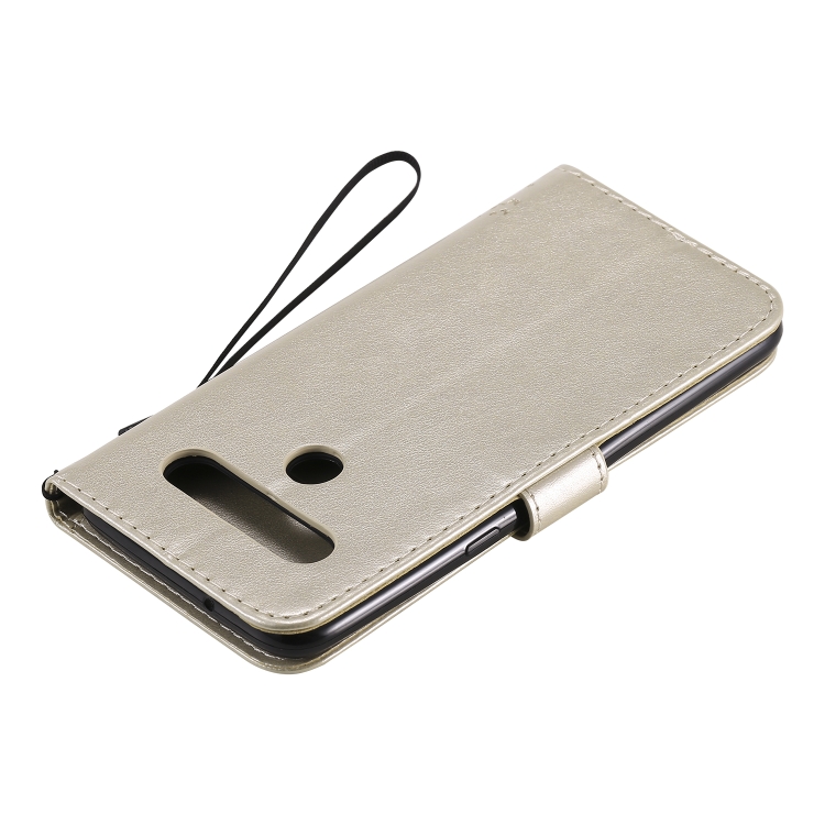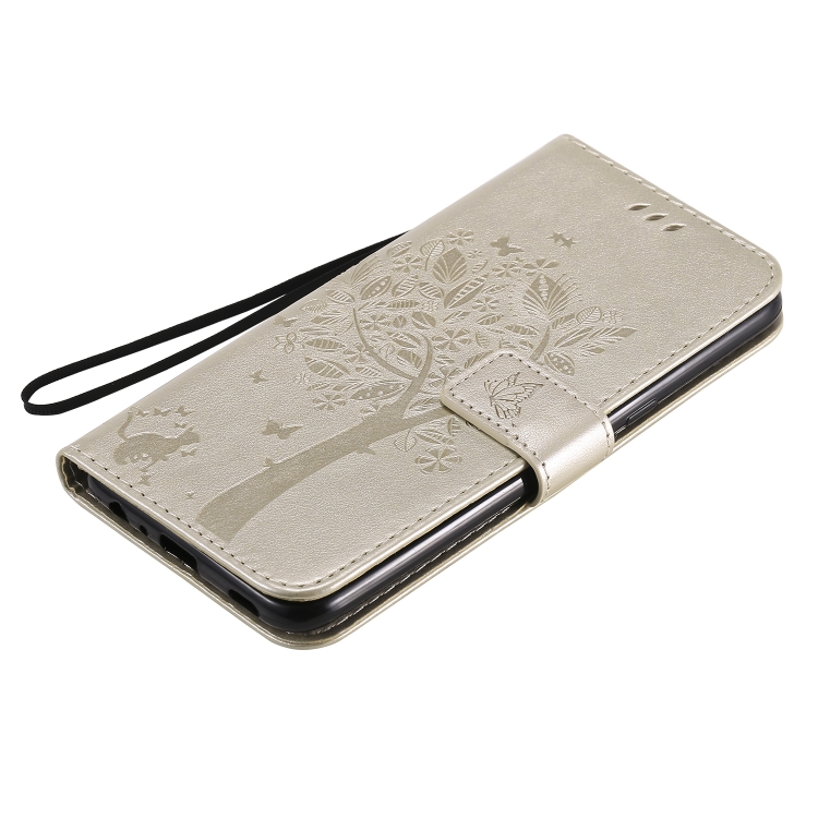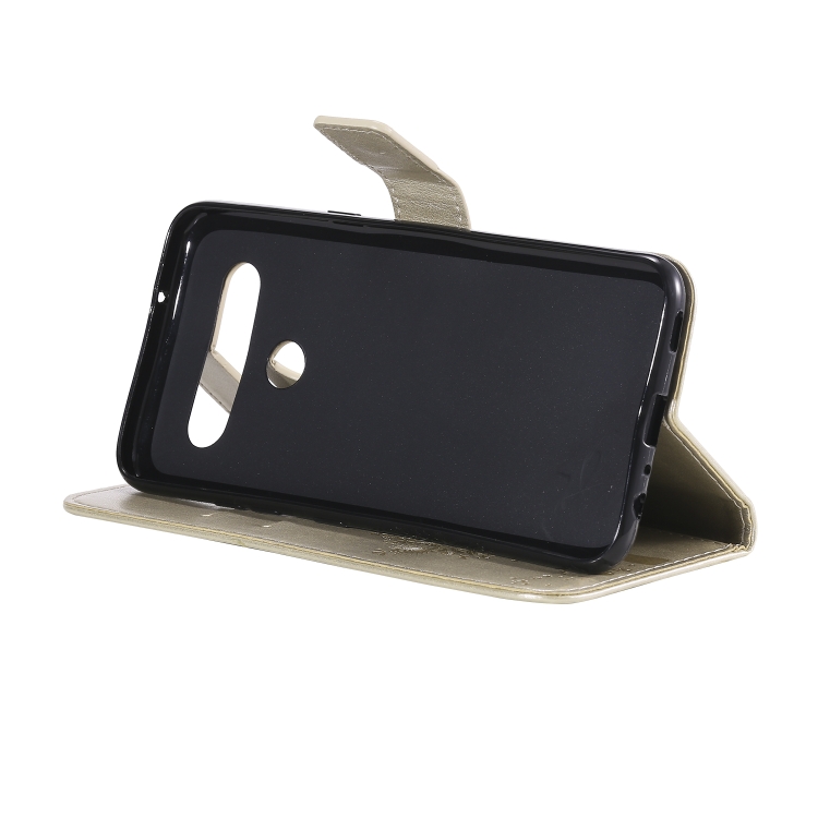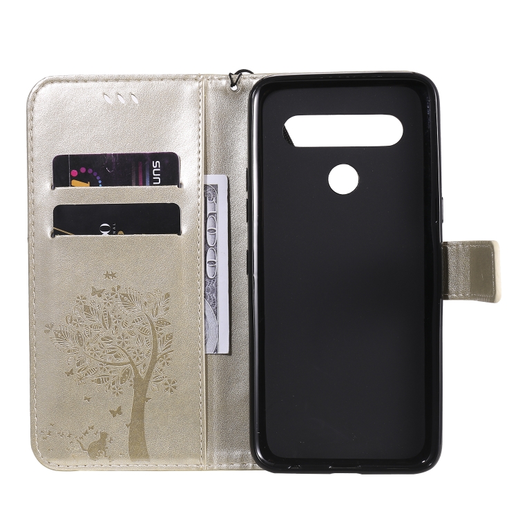 Funda de Cuero para LG K61 Tree & CAT con Tapa Horizontal, Soporte, Ranuras para Tarjetas, Billetera y Cordón (Dorado)