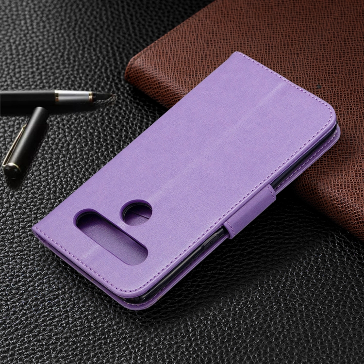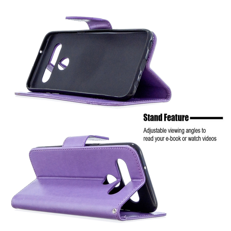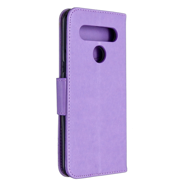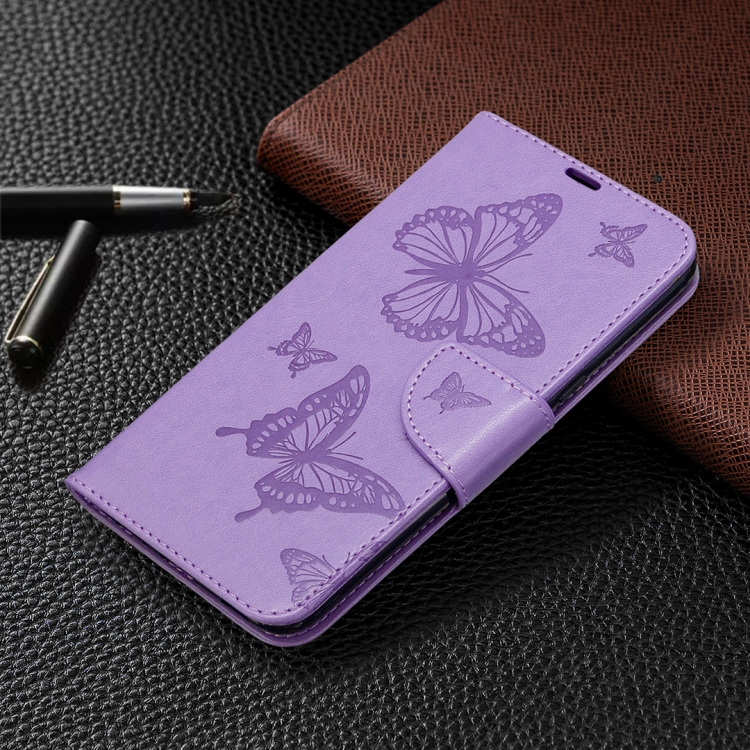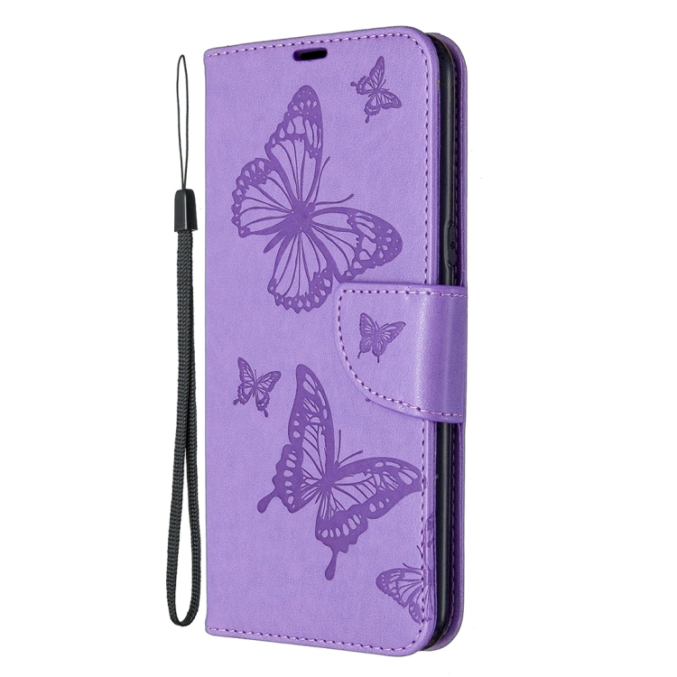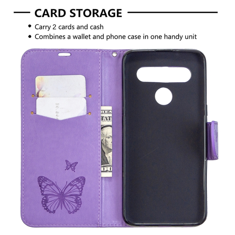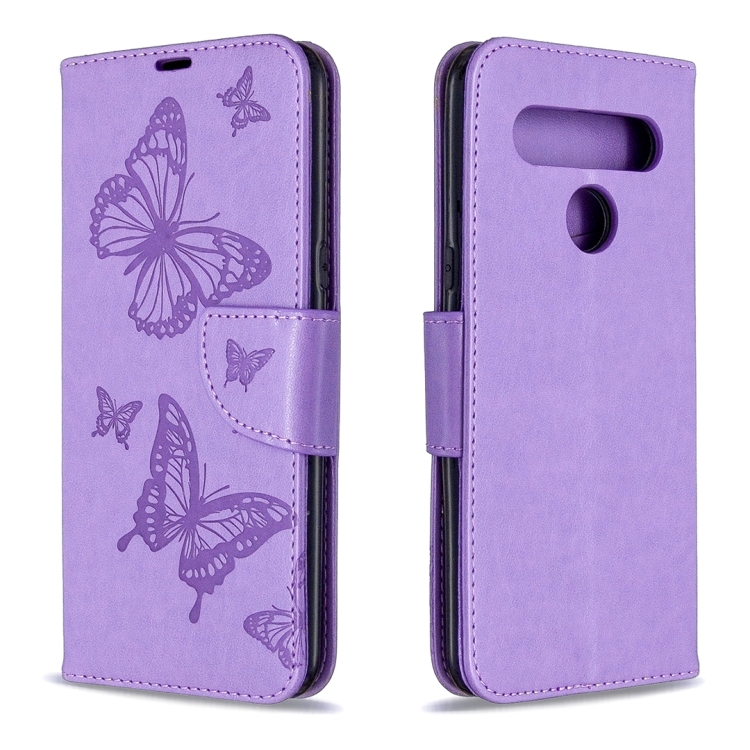 Funda de Cuero para LG K61 Two Butterflies con Tapa Horizontal, Soporte, Ranura para Tarjeta, Billetera y Cordón (Púrpura)