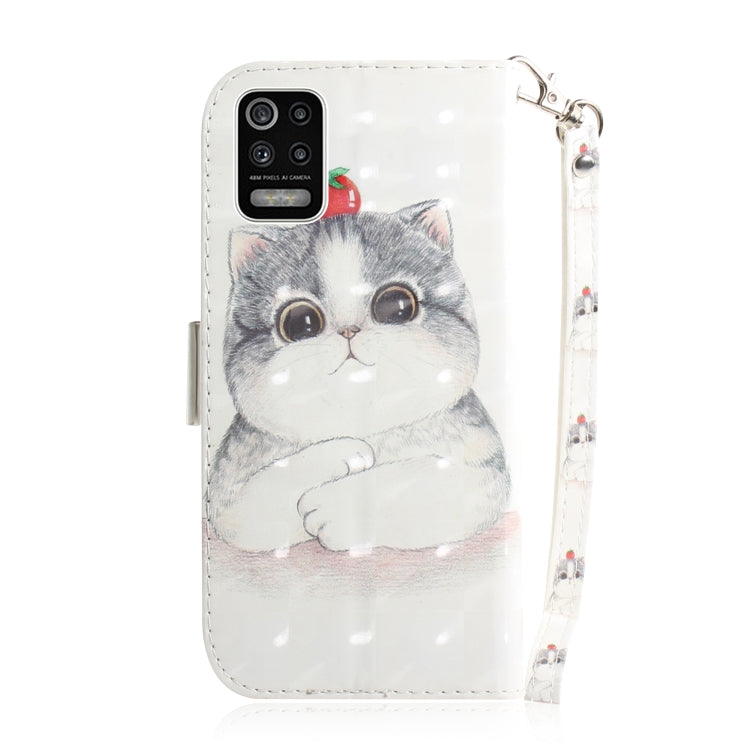 Funda de Cuero Abatible Horizontal para LG K62 / K52 / Q52 con Dibujo 3D, Soporte, Ranuras y Cordón (Gato Lindo)