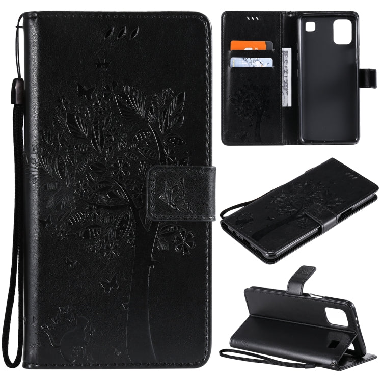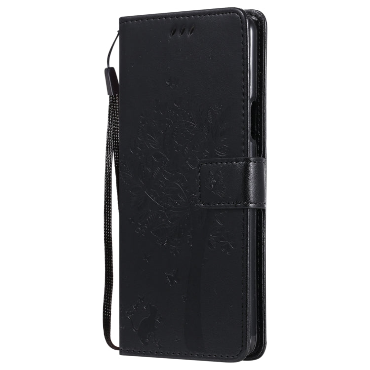 Funda de Cuero PU para LG K92 5G con Patrón Árbol y Gato, Soporte, Ranuras y Cordón (Negro)