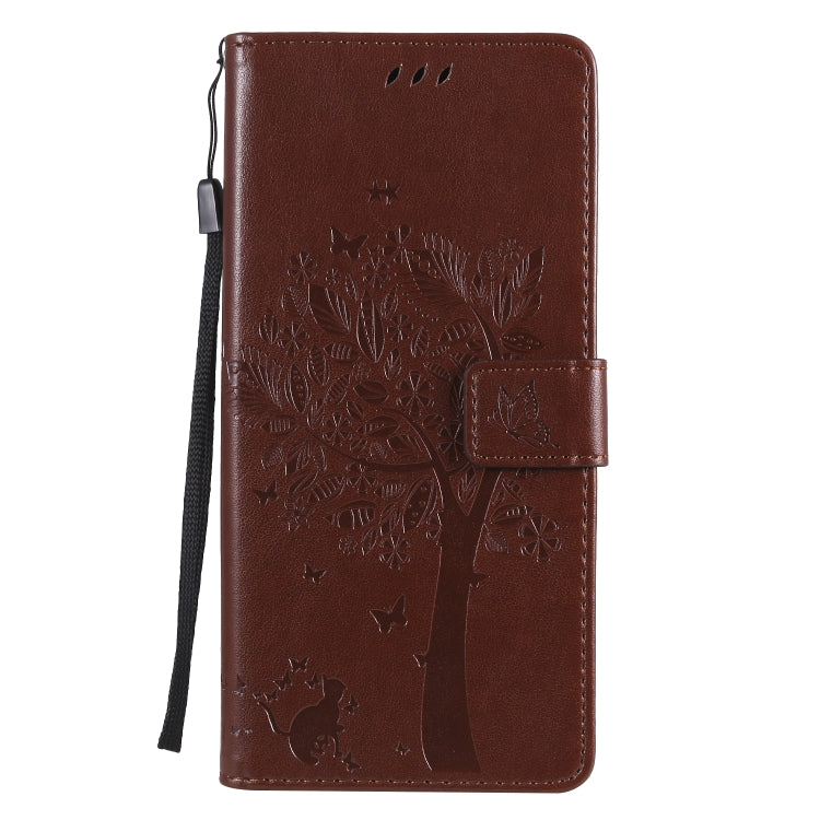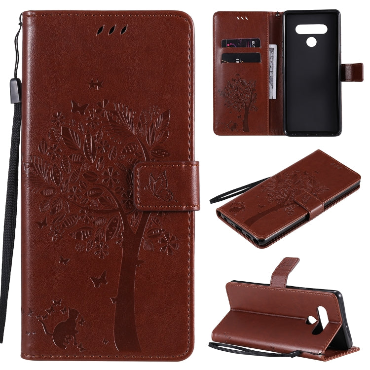 Funda de Cuero para LG Stylo 6 con Tapa Horizontal, Patrón Árbol y Gato, Soporte, Ranuras y Cordón (Café)