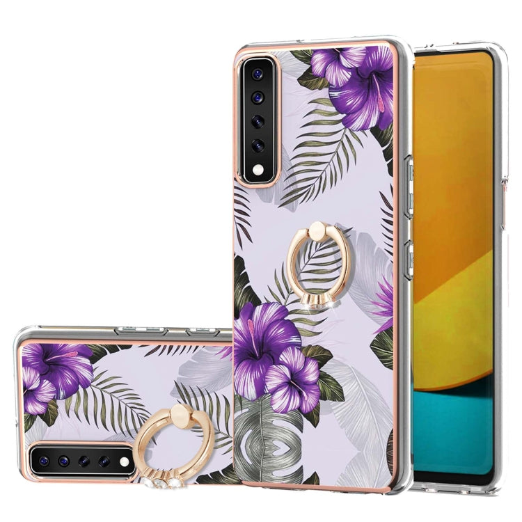 Funda TPU LG Stylo 7 4G Patrón Galvanoplatos a Prueba de Golpes con Soporte Anillo Diamantes (Flor Morada)