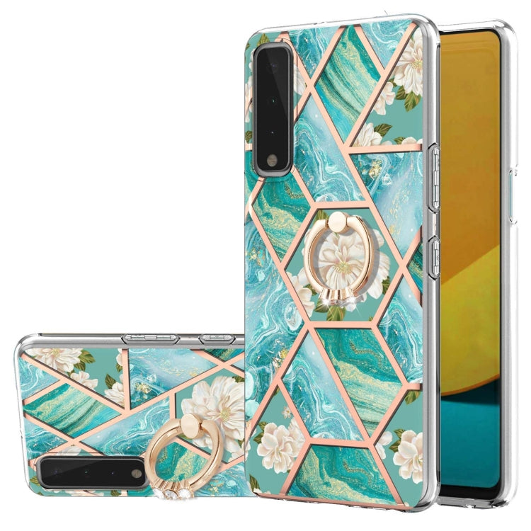 Funda TPU para LG Stylo 7 5G con Patrón de Flores Mármol y Soporte Anillo (Flor Azul)