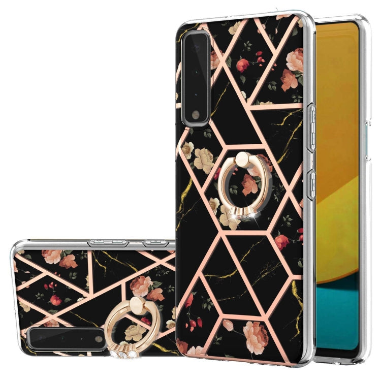Funda TPU para LG Stylo 7 5G con Patrón de Flores Mármol y Soporte Anillo Diamantes (Negra)