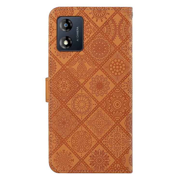 Funda de Cuero para Motorola Moto E13 con Patrón en Relieve Estilo Étnico (Marrón)