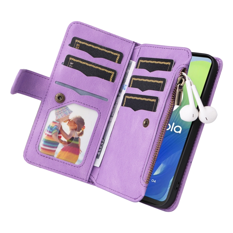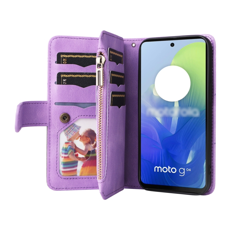 Funda Cuero para Motorola Moto G04 / G24 con Billetera, Cremallera y 9 Ranuras (Púrpura)