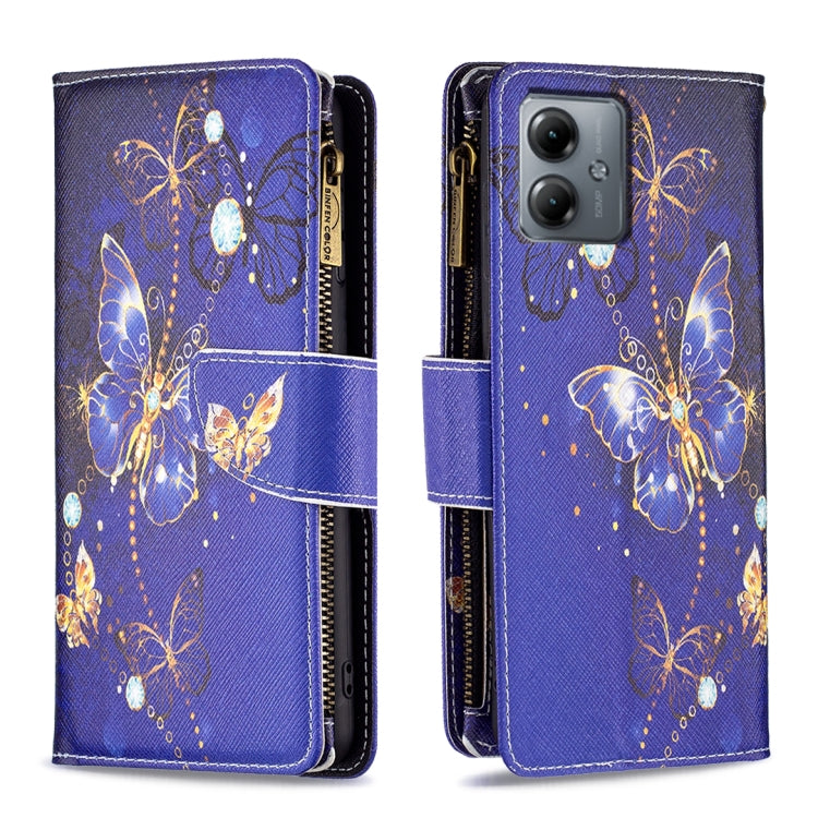 Funda de Cuero para Motorola Moto G14 4G con Cremallera y Dibujo Mariposa (Púrpura)