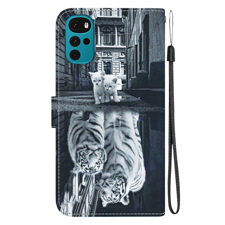 Funda de Cuero para Motorola Moto G22 con Dibujo Coloreado y Textura de Cristal (Reflejo de Tigre Gato)