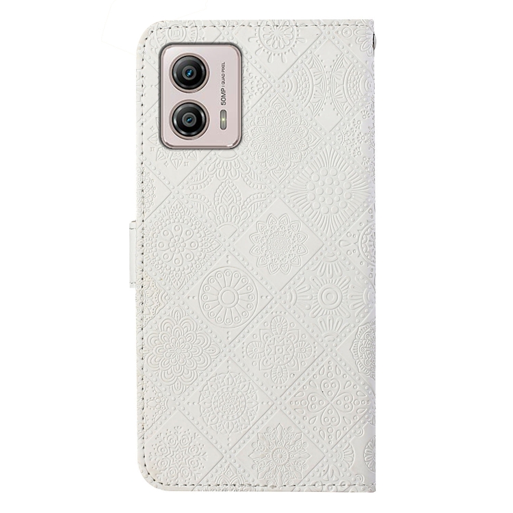 Funda de Cuero para Motorola Moto G53 con Patrón en Relieve Estilo Étnico (Blanco)
