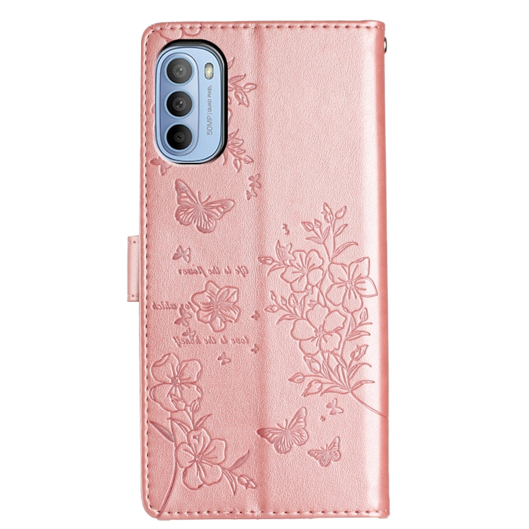 Funda de Cuero para Motorola Moto G62 5G con Mariposas y Flores (Oro Rosa)
