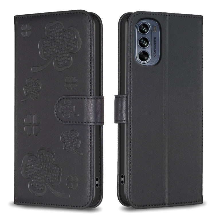 Funda de Cuero para Motorola Moto G62 con Relieve de Cuatro Hojas (Negro)