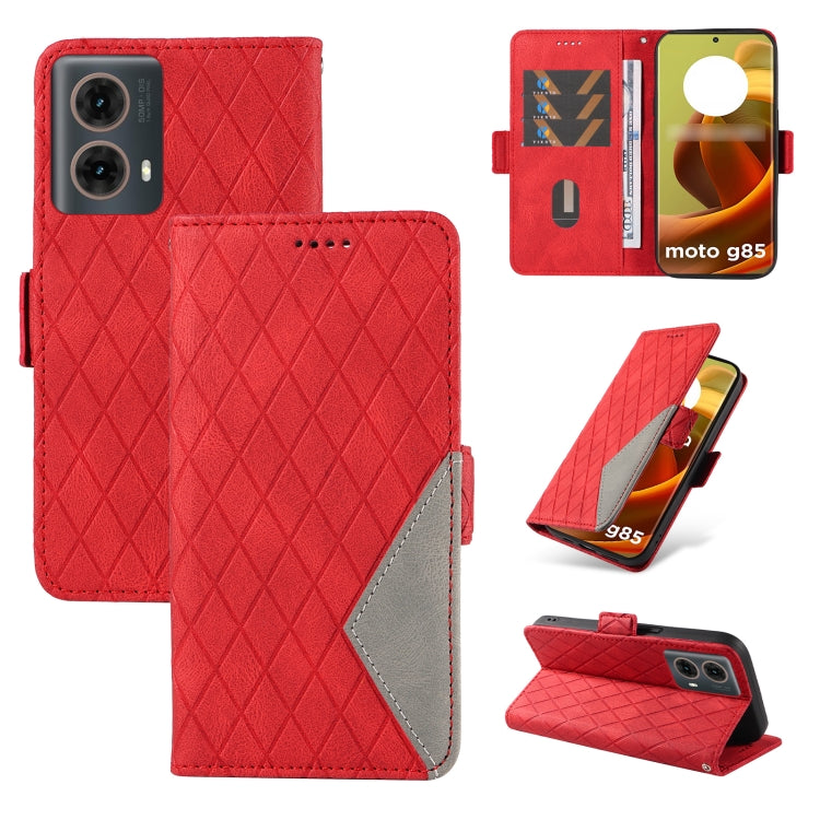 Funda de Cuero para Motorola Moto G85 con Entramado Rómbico de Dos Colores (Rojo)