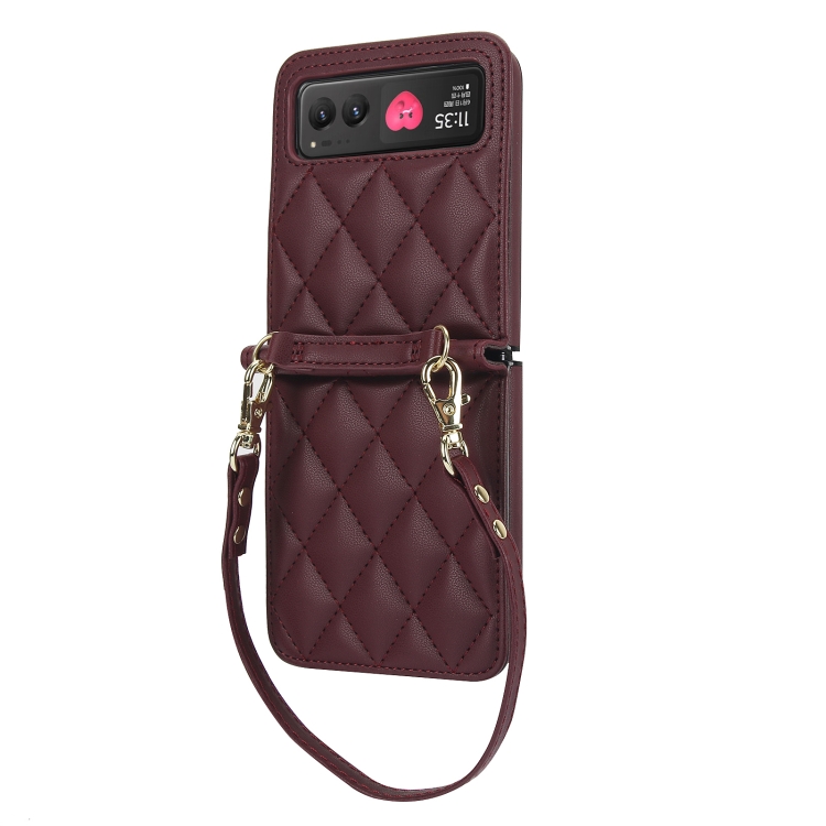 Estuche para Motorola Razr 40 con Textura Rómbica y Cordón Largo y Corto (Rojo Vino)