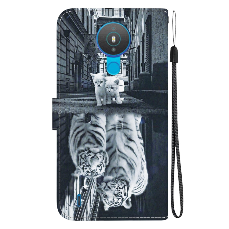 Funda de Cuero para Nokia 1.4 con Dibujo Coloreado y Textura de Cristal (Reflejo de Tigre Gato)