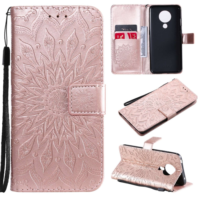 Para Nokia 5.3 Patrón de estampado en estampado de sol Horizontal Flip Funda con ranura para tarjeta y soporte y cartera y cordón (oro rosa)